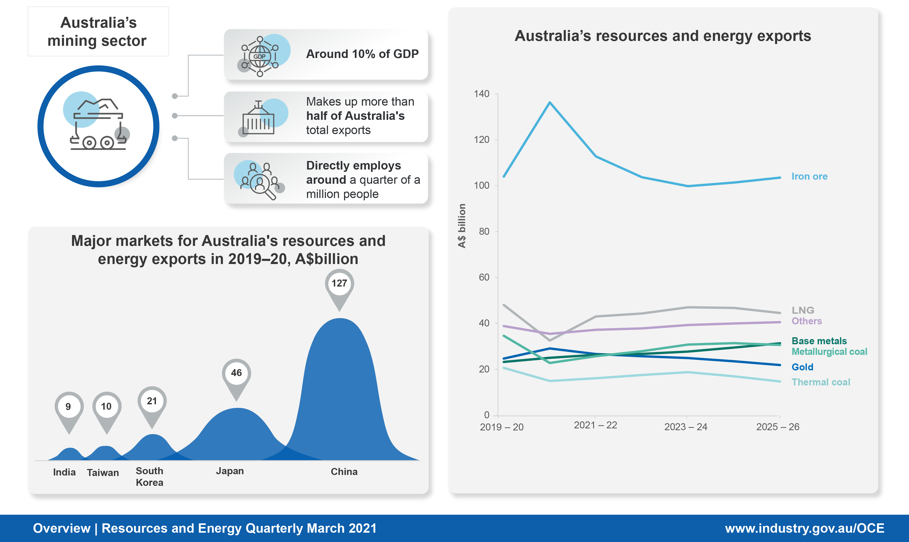 Minister for Resources, Water and Northern Australia Keith Pitt said the forecast result showed exports are on track to earn a record $296 billion in 2020–21 and remain strong over the next five years, driven by ongoing demand for iron ore and growth in technology-related commodities such as lithium, nickel and copper.