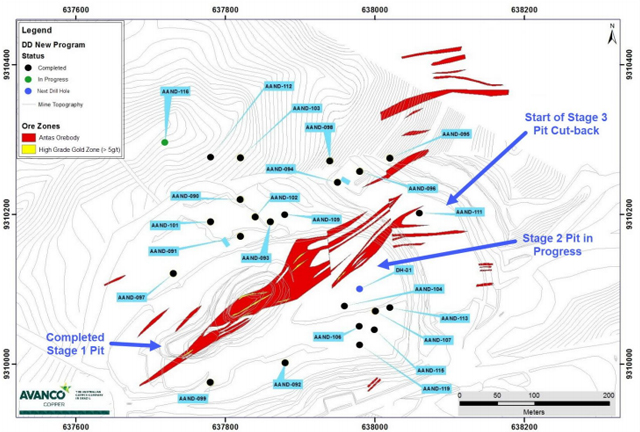 According to the exploration company, the AAND-103 first of three holes is under the existing Antas Pit and has returned excellent assay results with grades better than existing drilling on the same section.