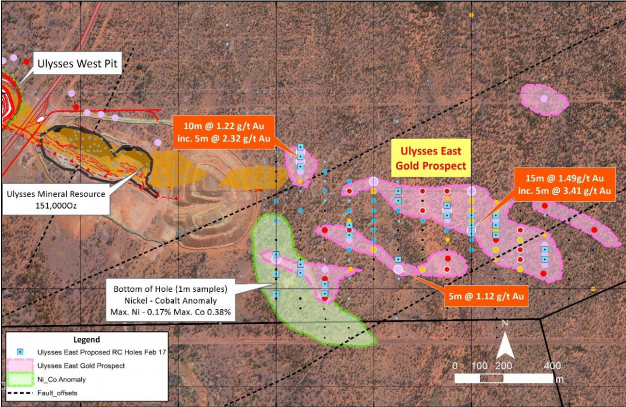 According to the company, the Ulysses East RC drill program will comprise approximately 2,500m of drilling and will consist of 10 fences of drilling at 100 to 200m spacings to test the anomaly over its entire strike length of 1.3km.