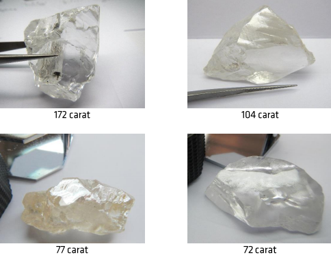 “These Specials follow the recent recovery if white Type IIa D-colour diamonds weighing 172 carats, 104 carats and 72 carats, and a 39 carat pink, the largest and most valuable fancy coloured diamond recovered to date at Lulo. The five white diamonds will be included in diamond sales scheduled for the current December 2016 Quarter.”