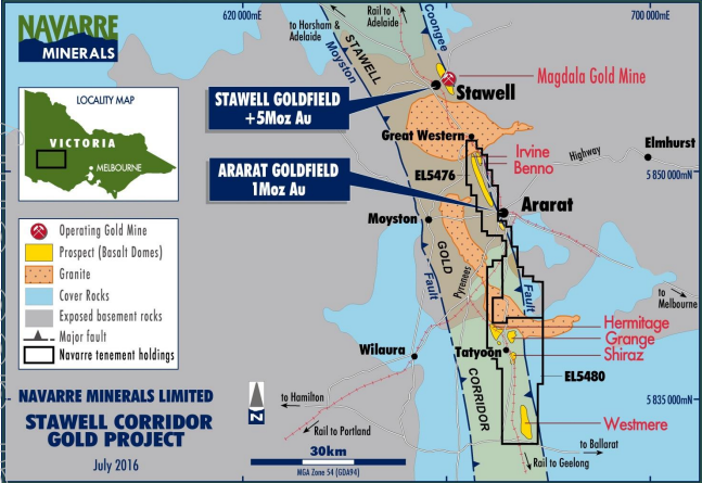 “Recent filed investigations have identified a number of shallow geochemical and geophysical targets proximal to the alluvial workings which may form part of the potential source to the Ararat Goldfields alluvial production,” Navarre told the ASX.
