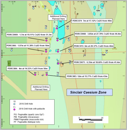 Pioneer said the program was designed to test extensions to the Sinclair Caesium Zone south of drill hole PDRC083 and north of PCRC074; and as an initial test of a high priority lithium-caesium target located 175m south of the Sinclair Zone.