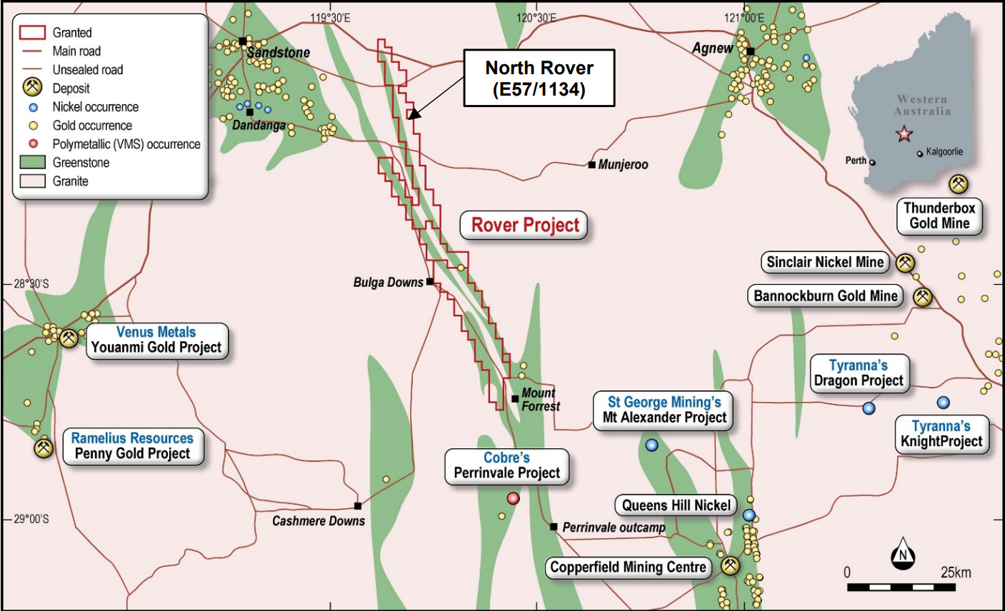The Rover Project is fully owned by TSC. It is located near Sandstone and consists of three exploration licenses which make up a large 460km² tenure package covering two linear Archean greenstones, with a combined length of around 160km.